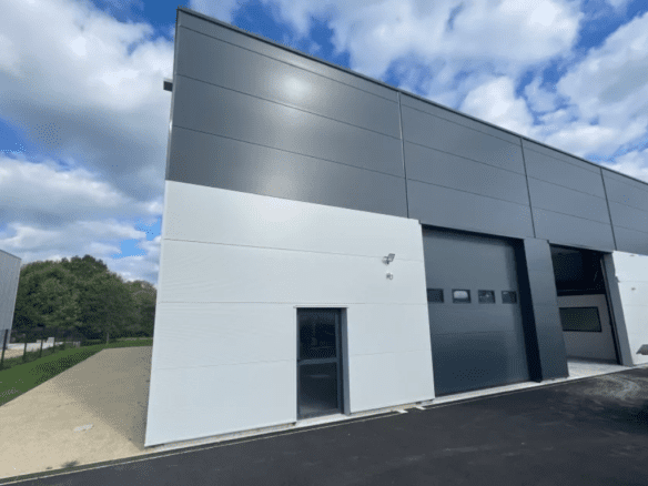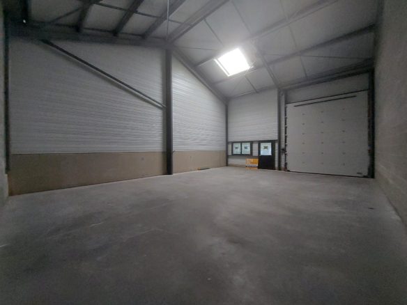 Le bien développe une surface d’environ 200 m² et est construit en double peau. Il est livré brut de béton, avec les fluides en attente, permettant un aménagement adapté aux besoins de l’utilisateur. Le local est équipé d’une porte sectionnelle motorisée, d’une porte de service, d’un éclairage LED, d’une alimentation prévue pour une prise triphasée ainsi que d’un compteur électrique individuel. Des places de stationnement privatives sont prévues au droit du bâtiment.