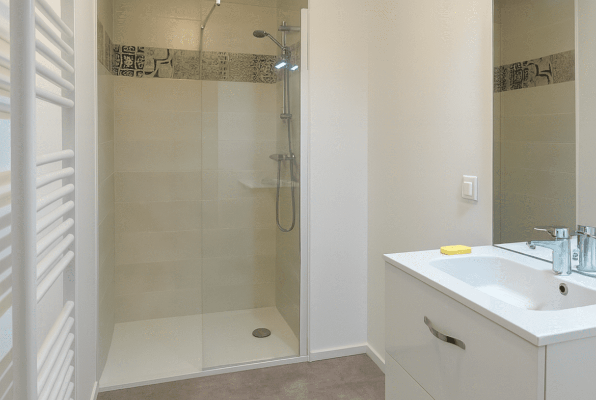 Le bien développe environ 60m² et se compose de deux chambres confortables dont une avec placard, d’une salle d’eau contemporaine et d’un WC indépendant ( normes PMR). Les aménagements ont été pensés pour un confort optimal au quotidien.