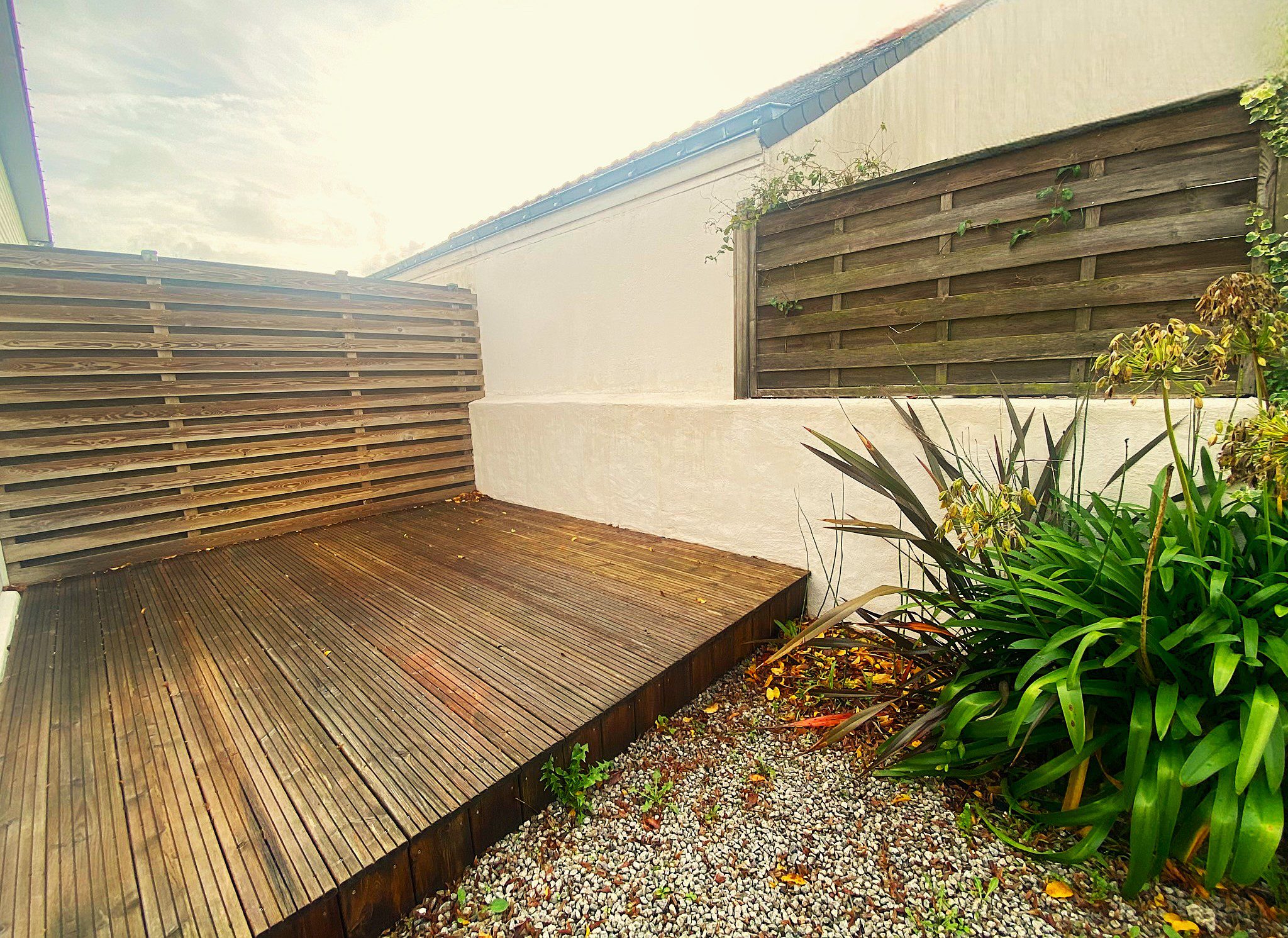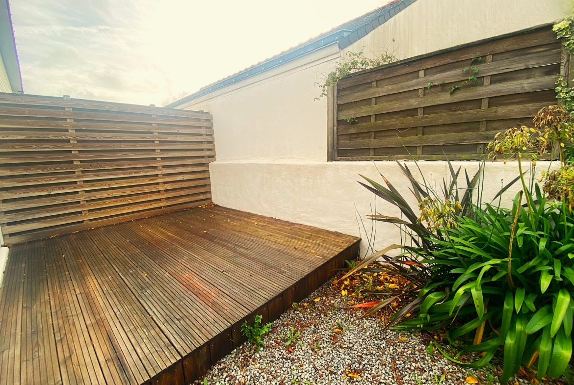 À l’extérieur, une cour végétalisée et une terrasse en bois sans vis-à-vis prolongent la maison , parfaite pour profiter d’un extérieur privé.