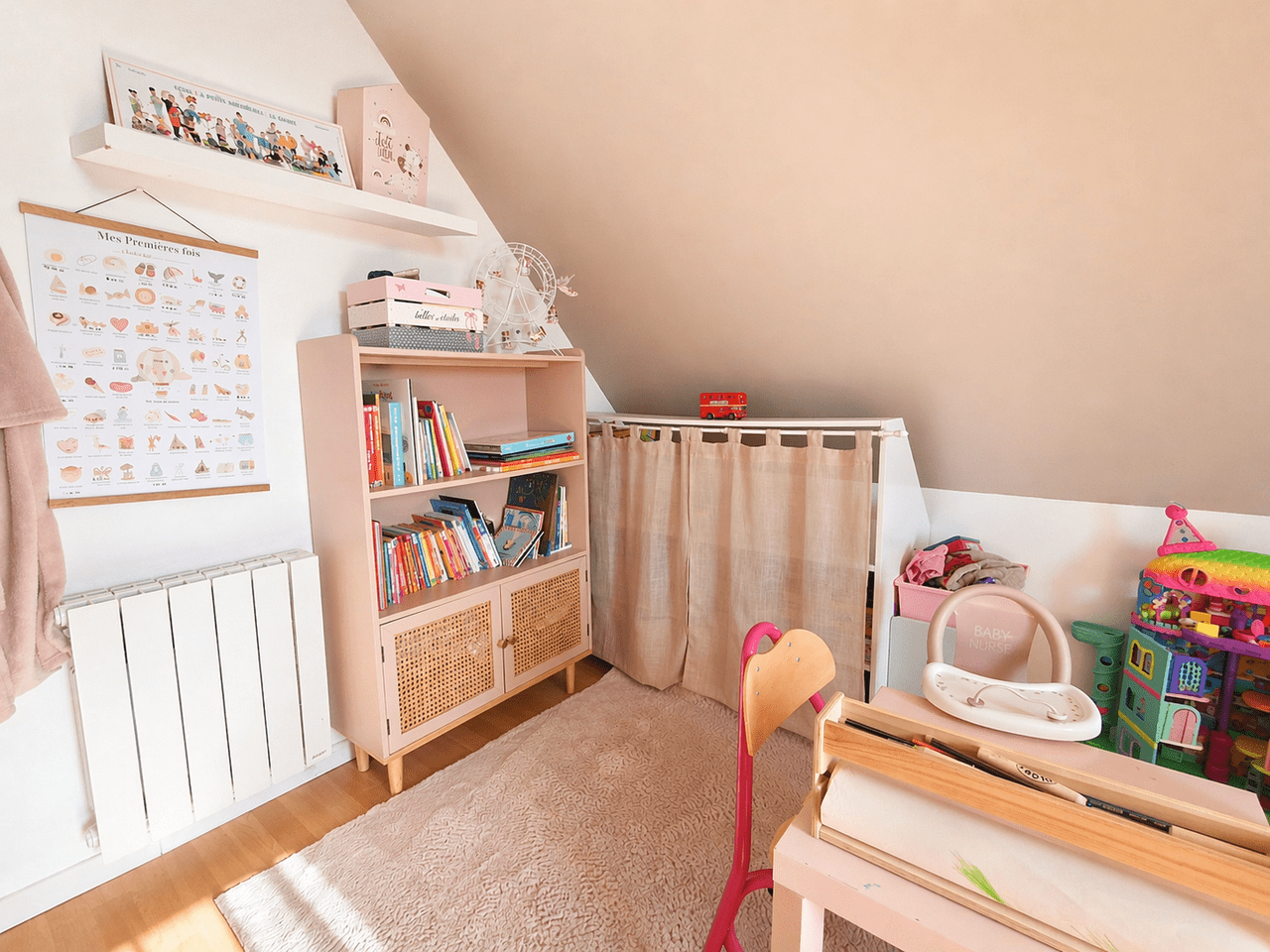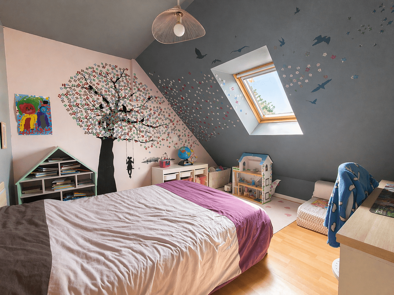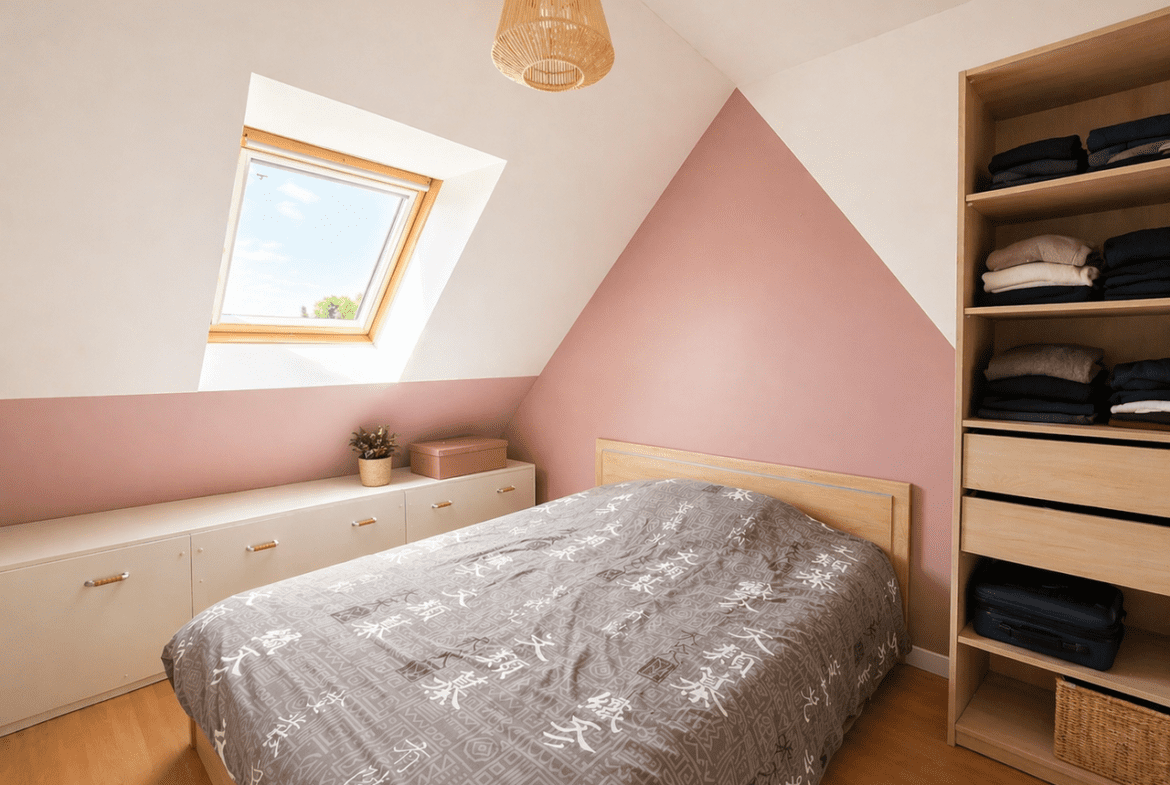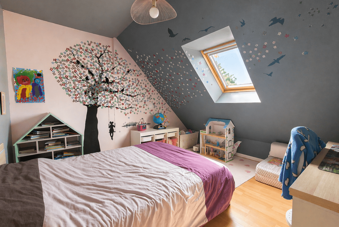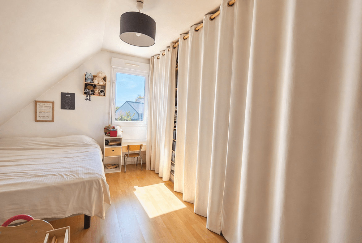 À l’étage, l’espace nuit accueille trois chambres confortables, chacune disposant de son dressing, offrant un agencement particulièrement apprécié au quotidien. Une salle de bain équipée à la fois d’une baignoire et d’une douche complète ce niveau.