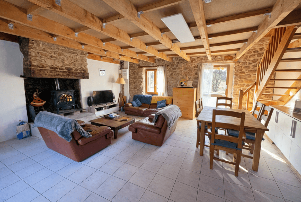 Cette maison en pierre pleine de caractère se compose, au rez-de-chaussée, d’une pièce de vie chaleureuse avec poêle, idéale pour créer une atmosphère conviviale, d’un espace cuisine fonctionnel ainsi que d’une salle d’eau avec WC permettant une organisation pratique du quotidien. À l’étage, vous découvrirez deux chambres, un dressing et un palier, offrant un potentiel d’aménagement intéressant selon vos besoins, que ce soit pour une résidence principale, un premier achat immobilier ou un projet locatif.