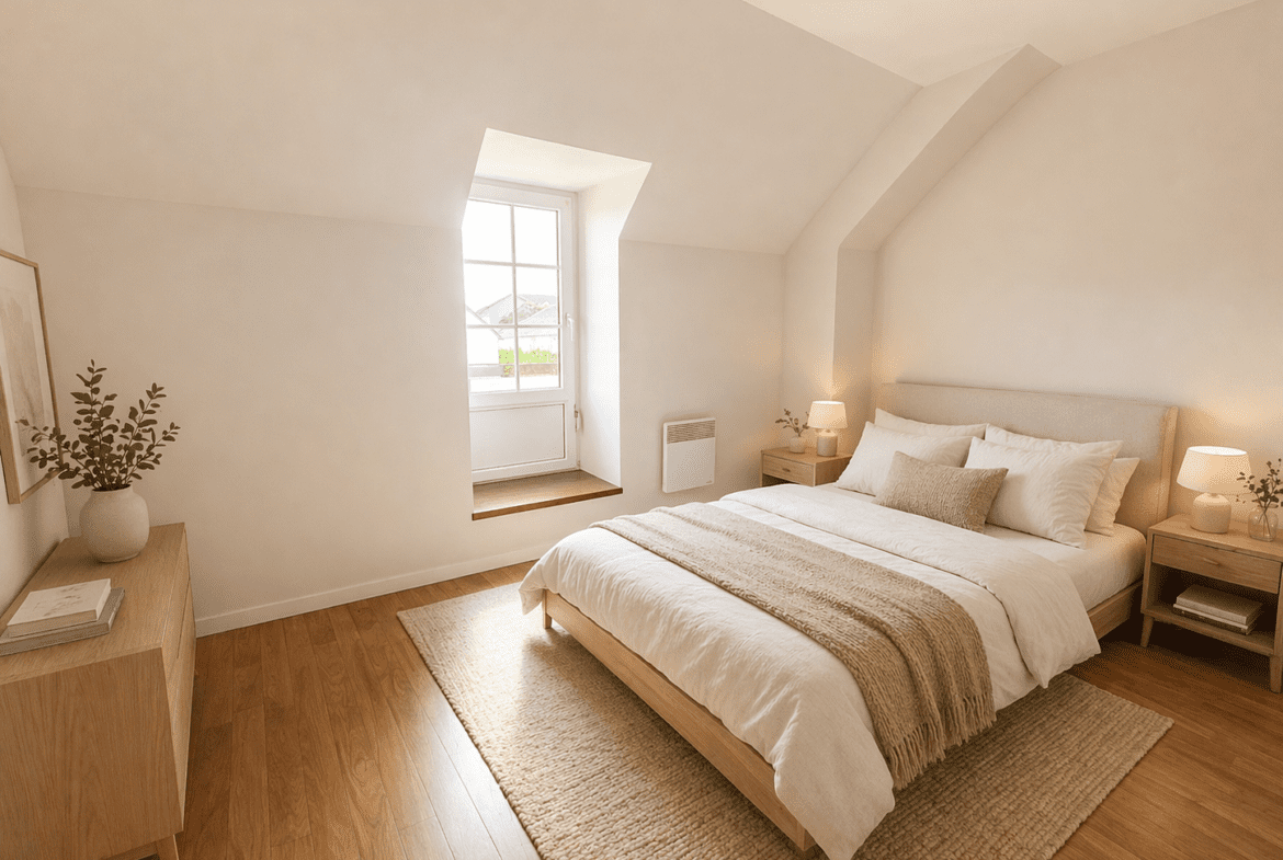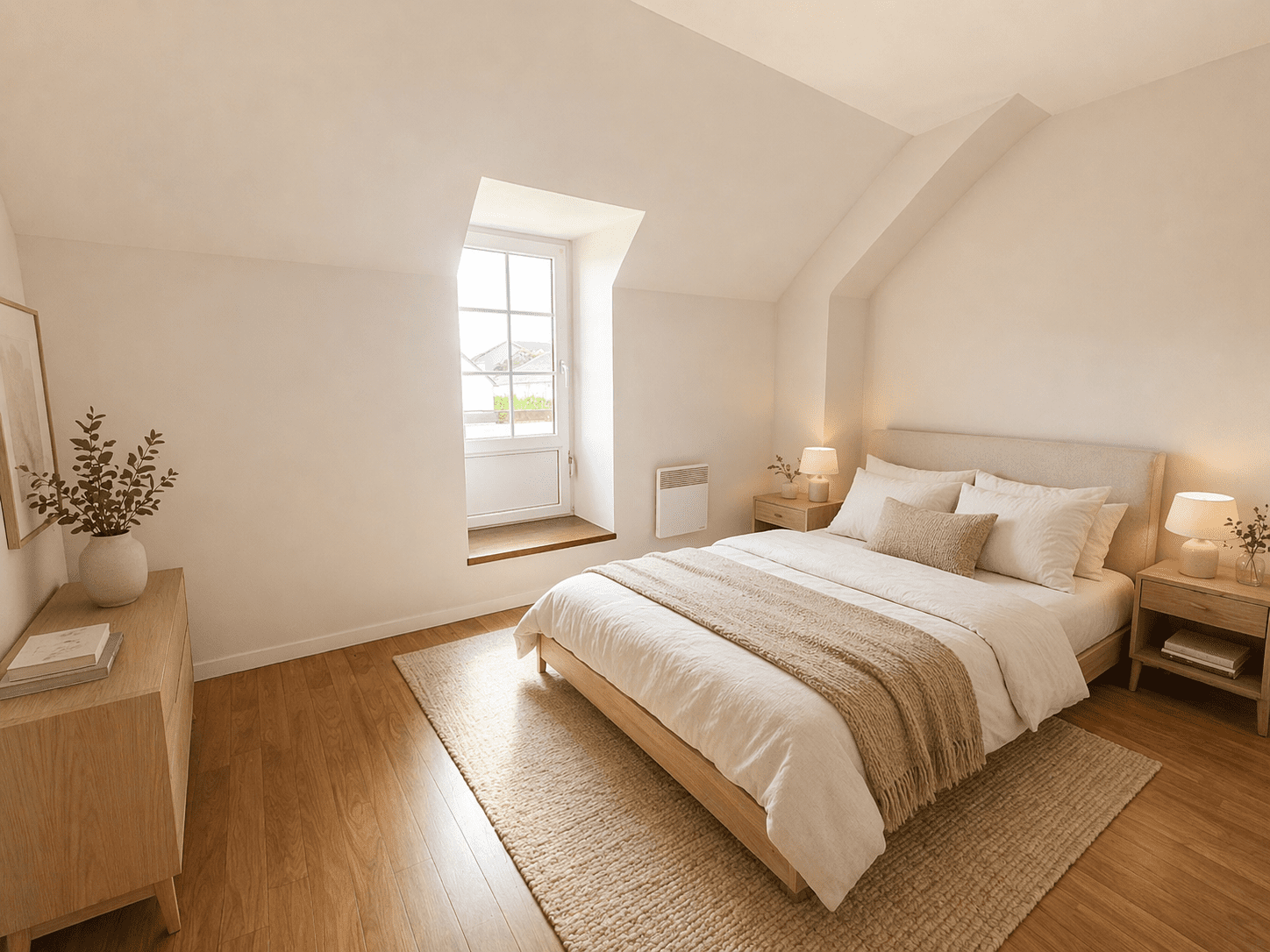 À l’étage, vous découvrirez deux chambres sur parquet, pleines de cachet, ainsi qu’une grande salle de bain, offrant un espace nuit confortable et fonctionnel.