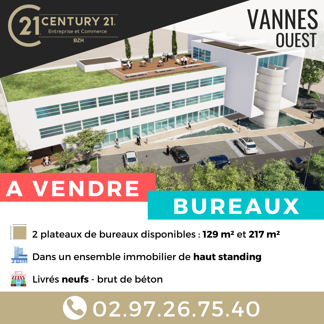 Bureaux disponibles à Vannes, dans un ensemble immobilier de haut standing, 2 plateaux de bureaux à vendre pour un total de 346 m² : Plateaux de 129 m² et 217 m²Locaux neufs, bruts de béton Découvrez nos offres sur notre site en cliquant ici ! Et pour plus d'informations : 02.97.26.75.40 ou...