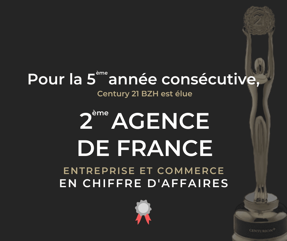 Nous avons le plaisir de vous annoncer qu’en 2020, et ce pour la 5ème année consécutive : votre agence BZH Entreprise et Commerce se place en deuxième position dans le Top 5 des agences Century 21 Entreprise et Commerce en chiffre d’affaires !