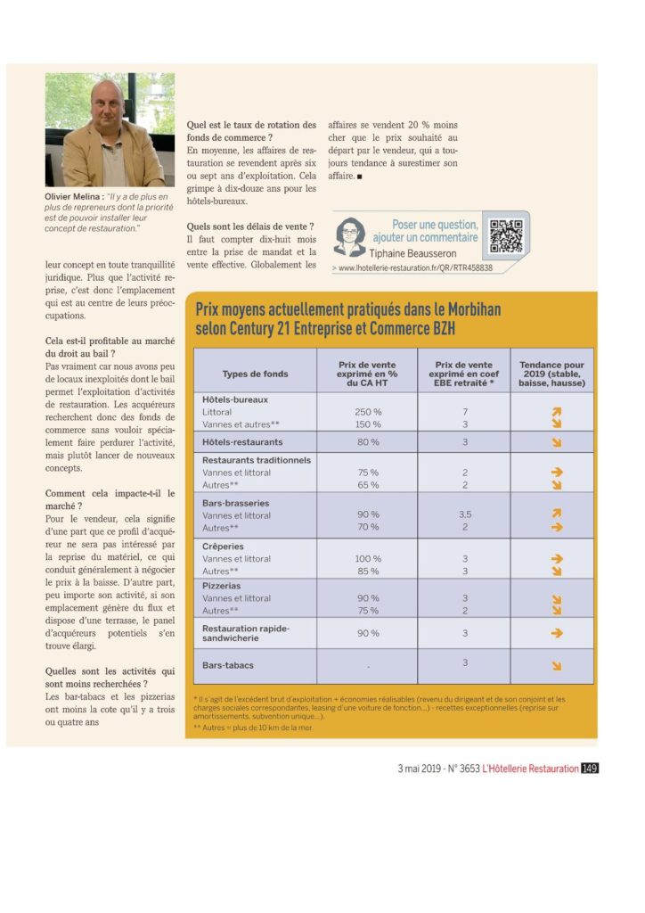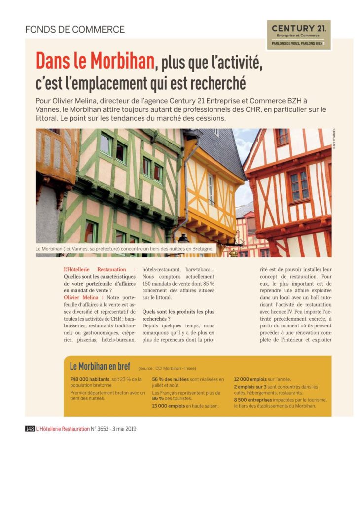 Zoom sur les tendances des cessions de Fonds de Commerce CHR dans le Morbihan Avec une interview de Century 21 BZH dans le dernier numéro de l’Hôtellerie Restauration