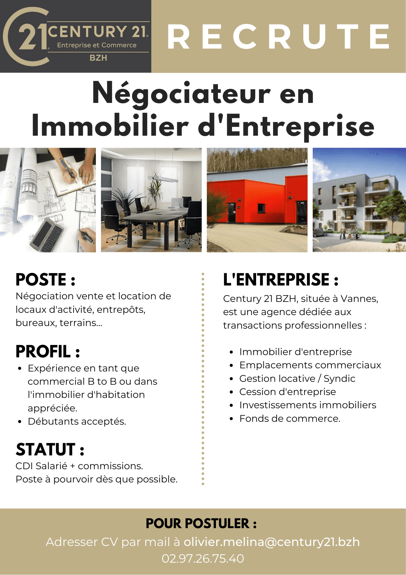 Dans le cadre de notre développement, notre agence recherche un négociateur en Immobilier d’Entreprise.